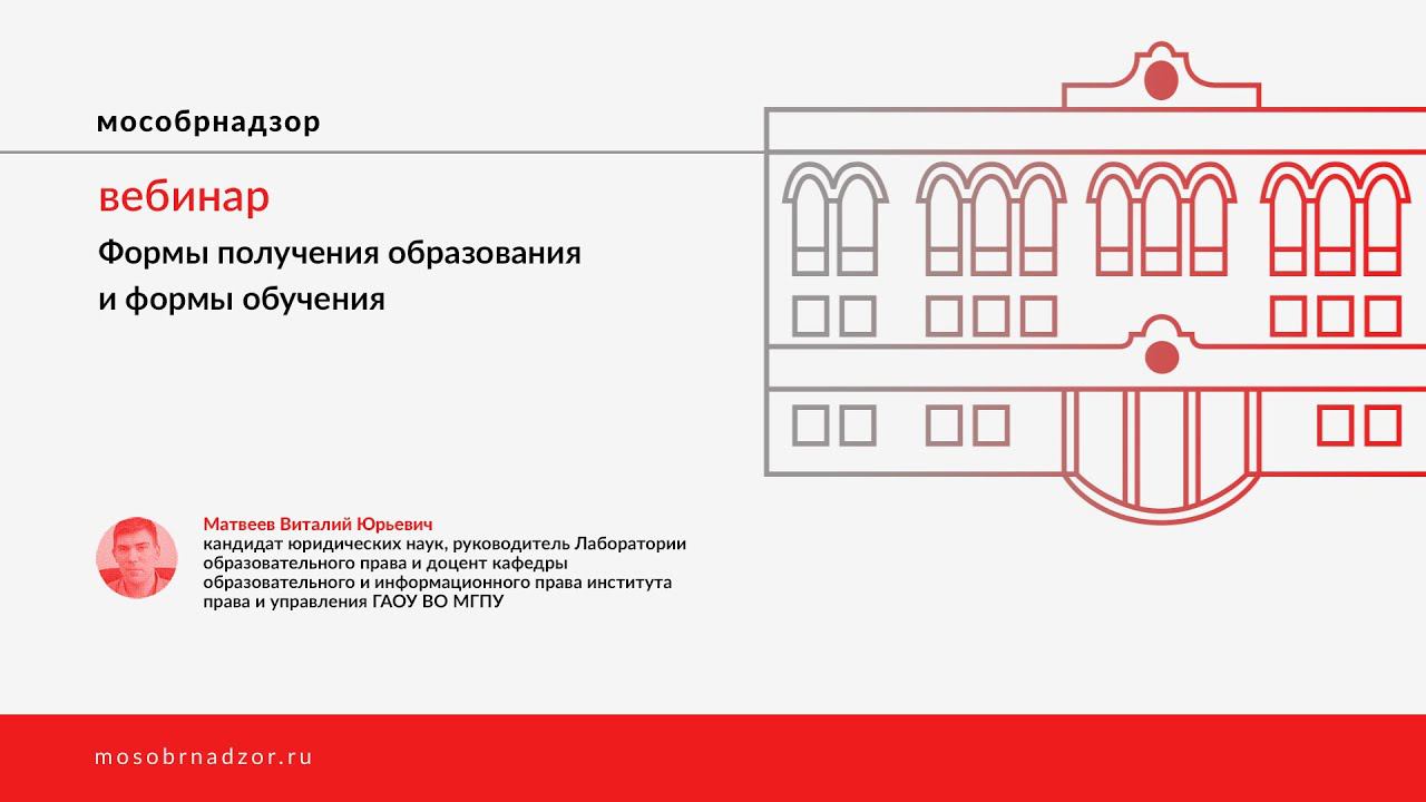 На вебинаре рассмотрены различные формы получения образования и формы обучения, а также смежные институты, не являющиеся отдельными формами обучения. Особое внимание уделено семейному образованию, экстернату и обучению на дому. Ведущий вебинара - Матвеев В.Ю. Страница вебинара на сайте проекта - http://mosobrnadzor.ru/prevention/webinars/2021-02-21_12-00