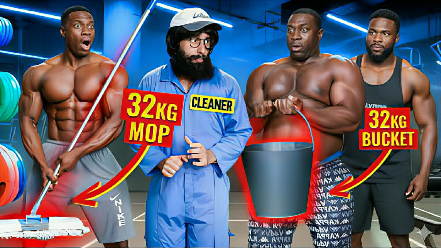 Уборщик стебется над качками в зале. Фейковая швабра и ведро