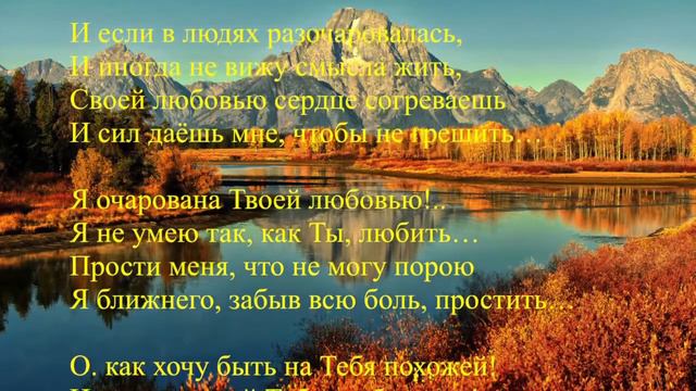 Мелодия / Музыка / Исполнение Лилия Айдэмюлер Автор/ Люба Бердышева Когда душа измученная стонет, И сердце, разрывается, болит, Я протяну к Спасителю ладони И верю – Он все раны исцелит. Когда не видно впереди дороги, И, кажется, - мой путь в тупик идёт, - Я утешенье нахожу лишь в Боге, Лишь Он всегда поддержит и поймёт. И если в людях разочаровалась, И иногда не вижу смысла жить, Своей любовью сердце согреваешь И сил даёшь мне, чтобы не грешить… Я очарована Твоей любовью!.. Я не умею так, как Ты, любить… Прости меня, что не могу порою Я ближнего, забыв всю боль, простить… О. как хочу быть на Тебя похожей! И жизнью всей Тебя отображать! Средь испытаний, что в пути пошлёшь мне, Дай силы, чтобы в битве устоять!