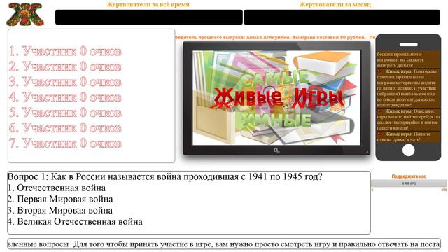 Помочь нам: Веб-мани: R172071790264 пожертвования через DonationAlerts: http://goo.gl/jP8MmE Яндекс: 410012019513464 ссылка на пожертвование: https://goo.gl/BvtyGw 1 игра "самые умные" Описание игры: https://vk.com/topic-23933509_33733082 2 игра "доберись до вершины" Описание игры: https://vk.com/topic-23933509_33733143 3 игра "о чём они говорят?!" Описание игры: https://vk.com/topic-23933509_33744717 Наш скайп: starichoks3