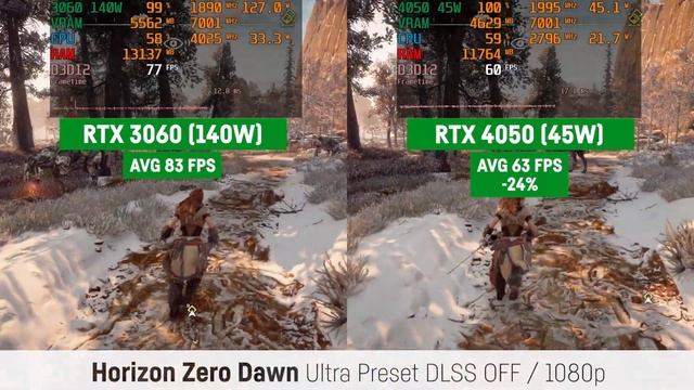 Comparing the Nvidia RTX 3060 140W vs. the RTX 4050 (45W Version) in 11 Games Laptop / Notebook Gaming! 00:00 Cyberpunk 2077 01:16 The Witcher 3 02:41 Microsoft Flight Simulator 03:57 Hogwarts Legacy 04:57 Atomic Heart 05:57 Horizon Zero Dawn 06:54 A Plague Tale: Requiem 08:10 God of War 09:11 Red Dead Redemption 2 11:05 Assassins Creed: Valhalla 12:27 Far Cry 6 Systems: Lenovo Legion 5 15ARH7H RTX 3060 Mobile 6GB 140W R7 6800H 16GB DDR5 5200 Mhz 1TB SSD WIN 11 vs. MSI Thin GF 63 12VE RTX 4050 6GB 45W (35W + 10W Dynamic Boost) i5 12450H 16GB DDR4 3200 Mhz 512GB SSD