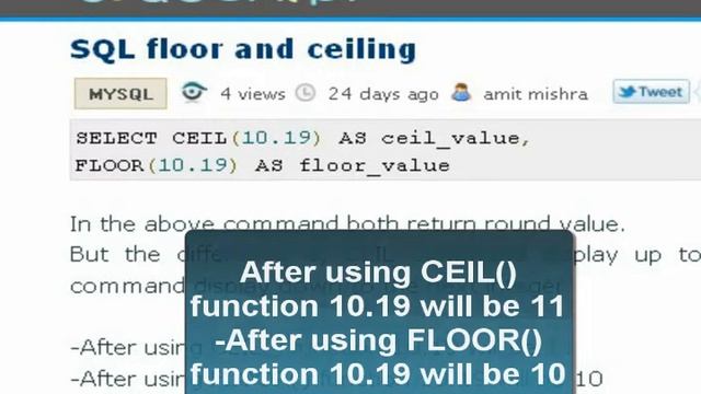 Both floor and ceil function are confused for beginner. So, user can not work it properly. So to use this function properly visit to codesnipr to get full information about this article. Codesnipr tutorial introduces video tutorial where beginner can easily clear about this article. http://www.codesnipr.com/snippet/864/SQL-floor-and-ceiling