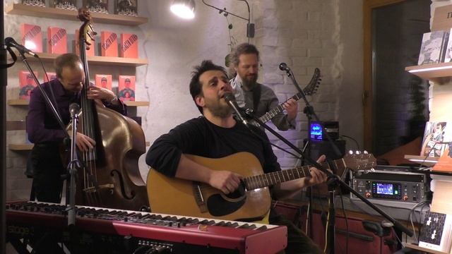 Концерт-квартирник Петра Налича с музыкантами в день рождения Издательского Дома "Поляндрия" в книжном магазине "Поляндрия Letters" на Садовой-Сухаревской, 28 сентября 2023 года. Состав: Пётр Налич (автор песен, вокал, гитара, клавиши), Геннадий Лаврентьев (скрипка, гитара), Сергей Сокулер (контрабас).
