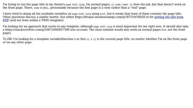 Drupal: How to get the front page title in page.html.twig? Helpful? Please support me on Patreon: https://www.patreon.com/roelvandepaar With thanks & praise to God, and with thanks to the many people who have made this project possible! | Content (except music & images) licensed under CC BY-SA https://meta.stackexchange.com/help/licensing | Music: https://www.bensound.com/licensing | Images: https://stocksnap.io/license & others | With thanks to user Oana Hulpoi (drupal.stackexchange.com/users/25040), user kiamlaluno (drupal.stackexchange.com/users/199), user Florian Brucker (drupal.stackexchange.com/users/58028), user Aram Boyajyan (drupal.stackexchange.com/users/8623), and the Stack Exchange Network (drupal.stackexchange.com/questions/193764). Trademarks are property of their respective owners. Disclaimer: All information is provided "AS IS" without warranty of any kind. You are responsible for your own actions. Please contact me if anything is amiss at Roel D.OT VandePaar A.T gmail.com