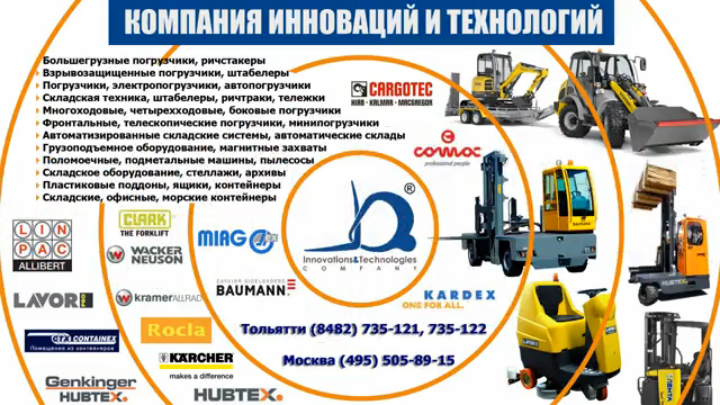 Эффективная модернизация производства и складов от ЗАО "Компания инноваций и технологий" Компания предлагает комплексное оснащение складских и производственных помещений в комплексе, реализуя полный спектр ПТО. Компанией осуществляется продажа погрузчиков, штабелеров, ричтраков и другой техники для склада. Также в каталоге продукции представлены автоматизированные склады, современная складская техника и поломоечная техника