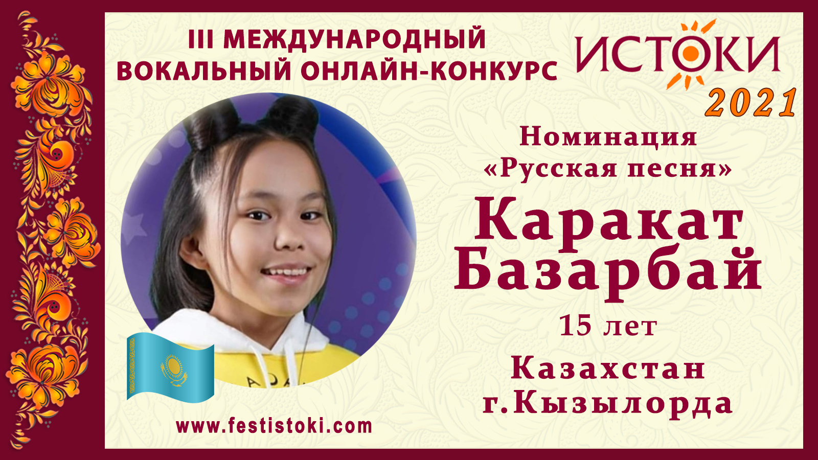 Лауреат II степени III Международного вокального онлайн-конкурса «Истоки». Номинация "Русская песня". Песня "Верни мне музыку" Авторы Арно Бабаджанян, А.Вознесенский. Сайт: www.festistoki.ru / www.festistoki.com E-mail: festistoki@mail.ru