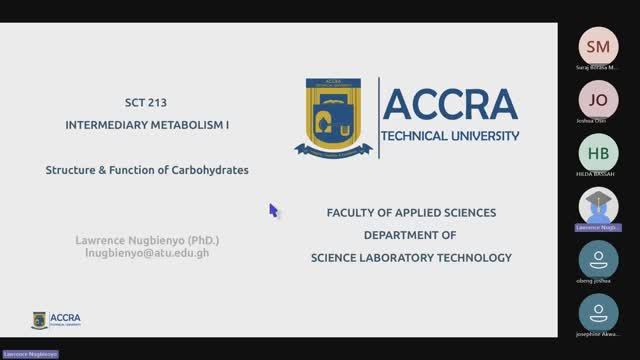 SCT 213 Biochemistry - Intermediary Metabolism I: Carbohydrate structure and function.