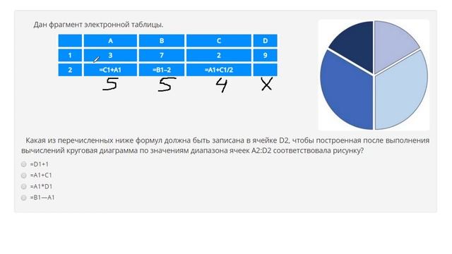 http://egoroffartem.pythonanywhere.com/oge/task/5 На сайте размещены другие задания по этой теме http://egoroffartem.pythonanywhere.com/oge/videotask/5 Список всех разборов 5 задания из ОГЭ по информатике: http://egoroffartem.pythonanywhere.com/oge/videotask/ Видео решения задач по ОГЭ информатике https://vk.com/egoroff_channel_oge В данном группе можете найти информацию о новых видео и задать вопросы по ОГЭ Информатике Разбор задания № 5 ОГЭ ИНФОРМАТИКА Тема задачи "Диаграммы в электронных таблицах" Дан фрагмент электронной таблицы. Какая из перечисленных ниже формул должна быть записана в ячейке D2, чтобы построенная после выполнения вычислений круговая диаграмма по значениям диапазона ячеек A2:D2 соответствовала рисунку? =D1+1 =A1+C1 =A1*D1 =B1—A1
