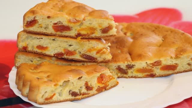 Потребуется: - кефир - 300 грамм - яйца - 2 штуки - сахар - 200 грамм - мука - 300 грамм - сода - неполная чайная ложка соды - курага - по вкусу.