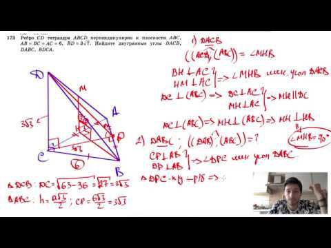 №173. Ребро CD тетраэдра ABCD перпендикулярно к плоскости ABC, АВ = ВС = АС = 6, BD = 3√7. Найдите двугранные углы DACB, DABC, BDCA. Поддержать канал рублём - 5469400944002125 (Сбербанк) Мой второй канал для подготовки к ЕГЭ и ОГЭ - https://www.youtube.com/ЕвгенийСумин Инстаграм - https://www.instagram.com/EGE_OGE.math Личный инстаграм - https://www.instagram.com/ee_sumin VK - https://vk.com/evgeniysumin FB - https://www.facebook.com/EvgeniySumin