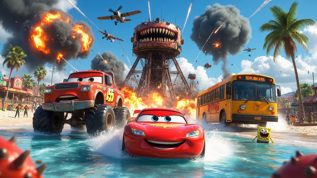 Мультик тачки Молния Маквин и Губка Боб бегут от Зомби. Жуткий аквапарк лишь началло. Беги,Мак!