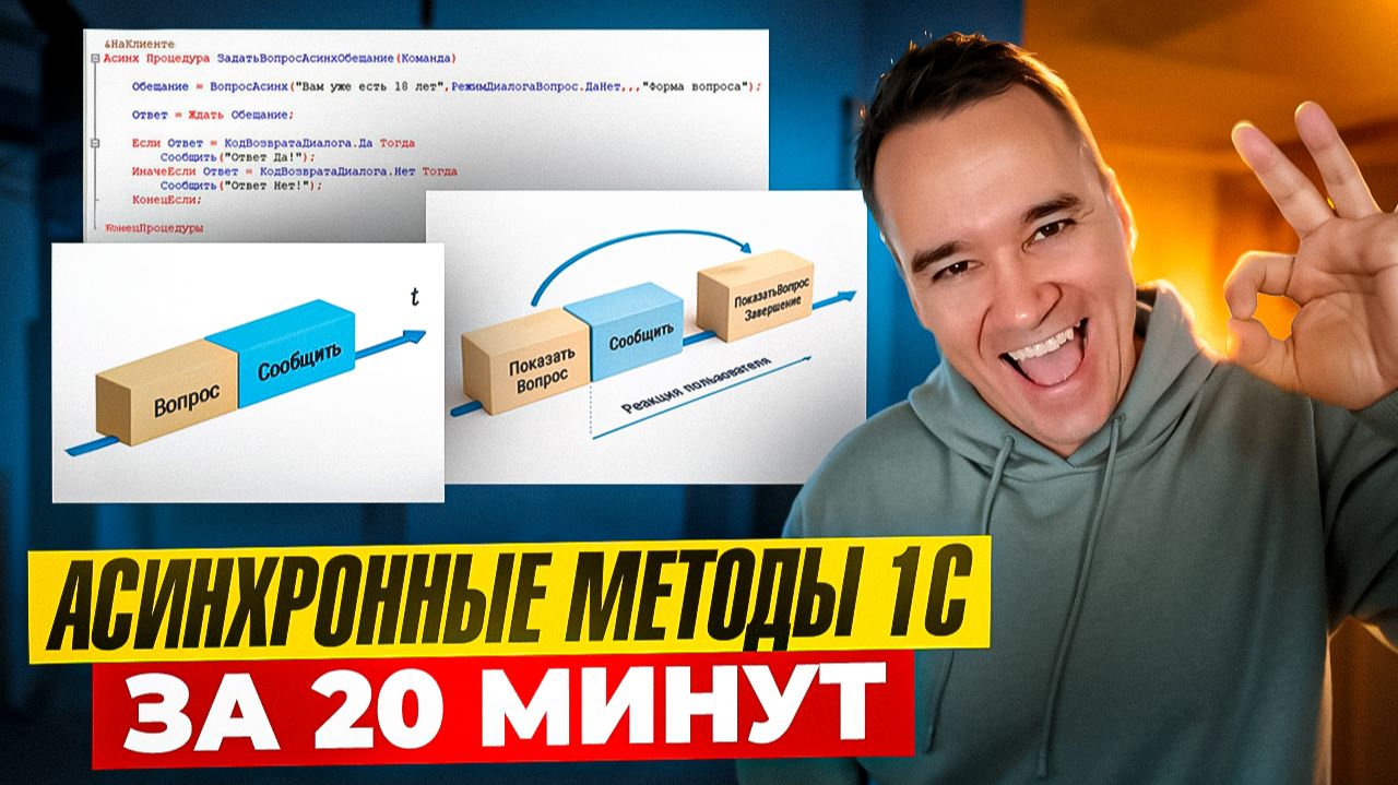 #Программирование1С #Конфигурирование1С #Обучение1С Все продукты в одном месте 👉 https://lp2.1s-up.ru/ ТГ-канал по программированию в 1С: https://t.me/Programming1CNizamutdinov В этом видео разберём, как работают асинхронные методы в 1С, чем они отличаются от синхронных и в каких случаях их стоит применять на практике. Покажу примеры использования асинхронных методов с описанием оповещения и с обещанием, разберём их логику шаг за шагом. Ролик будет особенно полезен тем, кто только начинает знакомиться с 1С и сталкивается с тем, что работа асинхронных методов кажется сложной и непонятной. 0:00:00 - Введение; 0:00:41- Применение синхронного метода; 0:06:55 - Асинхронный метод с описанием оповещения; 0:12:06 - Асинхронный метод с обещанием; Для тех, кто только начал изучать программирование в 1С: книга "Программировать в 1С за 11 шагов". Первые 4 главы БЕСПЛАТНО: http://lp.1s-up.ru/programing_1c_11_steps_prima/ Промо-код на скидку: tube Присоединяйтесь к нам ВК: https://vk.com/1c_prosto Присоединяйтесь к нам в Фейсбуке: https://www.facebook.com/groups/922972144448119/ Присоединяйтесь к нам в ТГ: https://t.me/Programming1CNizamutdinov Ссылка на чат в ТГ: https://t.me/+CD9Wapqe3ZBlNDJi