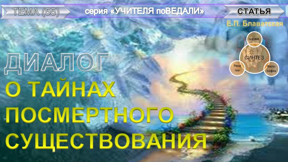 О ПОСМЕРТНОМ СУЩЕСТВОВАНИЯ--Вопросы и Ответы-труды Блаватской Е.П.- из серии "Учителя ПоВедали" - Жизненный ПРИНЦИП "Синтез науки, религии и философии" - так обозначала суть своих трудов сама Елена Петровна Блаватская (1831-1891 г.г.) - великая наша соотечественница (урожденная Ган в г. Екатеринослав Российской империи, позднее переименованный г. Днепропетровск УССР, ныне в г. Днепр Украина), - стоявшая у истоков экстраординарного мировоззрения, основательница Теософского Общества (1875 Нью-Йорк).