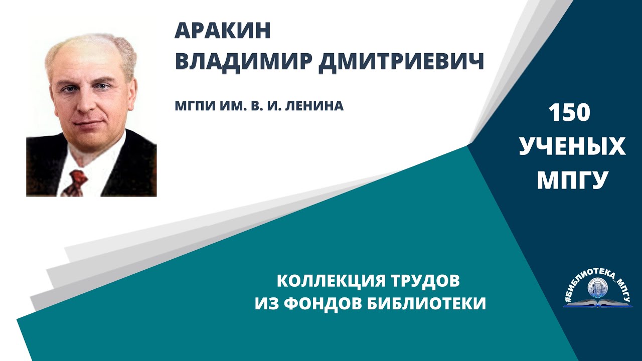 О научной и педагогической деятельности профессора Аракина В. Д. рассказывает доктор филологических наук, профессор, профессор Кафедры фонетики и лексики английского языка им. В. Д. Аракина МПГУ Чупрына О. Г. Создатели проекта: авторы идеи – Лиханова И. В., директор библиотеки МПГУ, Свирина М. Н., заведующий информационно-справочной службой библиотеки МПГУ; подготовка материалов – Давыдов Е. А., библиограф; текст за кадром – Самородов Б. А., библиограф; монтаж – Климова А. А., главный библиотекарь. Вопросы о доступности изданий из фонда Библиотеки МПГУ Вы можете направить на почту: lib_ms@mpgu.su . Адреса отделов Библиотеки МПГУ Вы можете посмотреть, перейдя по ссылке: http://mpgu.su/ob-mpgu/struktura/biblioteka/struktura/ #МПГУ #150ЛетМПГУ #ЮбилейМПГУ #Ученые #Аракин