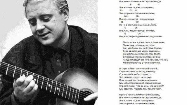 Выложил эту грустную песню, чтобы напомнить, что оригинал существенно отличается от более известной переделки. Сам я впервые услышал переделку лет 30 назад и воспринял её как довольно бодрую и жизнеутверждающую песенку Визбора. Ещё бы, ведь несмотря на упоминание сожженных мостов и Страшного суда, в целом, мы молодцы, ведь каждый из нас СДЕЛАЛ всё, что мог. Однако, позднее оказалось, что песня Визбора на самом деле про то, что "Каждый ПРЕДАЛ всё, что мог". Вот тут уже и "мосты", и "Страшный суд", и "прошёптанные клятвы в ночи", и "прожитое прожито зря" зазвучали совсем по-иному. А казалось бы - пустяк: всего-то одно слово было изменено в оригинальном тексте Ю.Визбора.