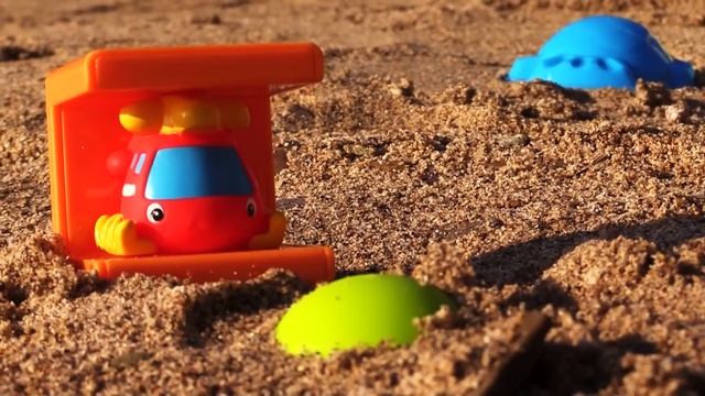 Видео про машинку и вертолётик на пляже. Строим пирамиду