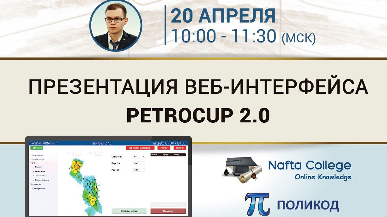 Webinar: Demonstration of PetroCup 2.0 web interface Description: This webinar will demonstrate the functionality of the PetroCup 2.0 web interface. All participants will be able to see to what kind of asset data is available at the start of the session, how to perform drilling operations, workovers, set production targets, how to call well surveys, and where to view the "asset response" to user actions. Date: April 20, 10:00 (UTC+3) Speaker: Arseniy Egorov Company: Polykod Language: Russian Наименование: Презентация веб-интерфейса PetroCup 2.0 Описание: На вебинаре будет продемонстрирован функционал веб-интерфейса PetroCup 2.0. Участники смогут увидеть, какая информация по активу доступна на начало сессии, как производить бурение, ремонты, задавать режимы скважин, как проводить исследования скважин и где просматривать отклик актива на действия пользователя. Дата: 20 апреля (UTC+3) Докладчик: Арсений Егоров Компания: Поликод Язык: Русский