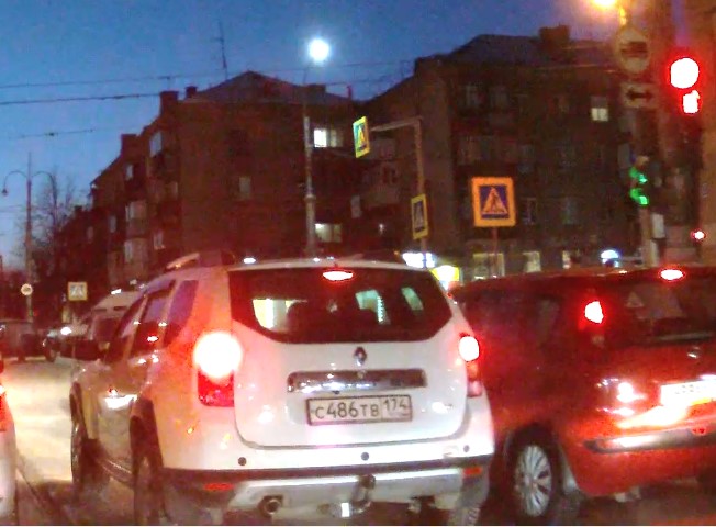 Выезд на перекрёсток на запрещающий движение сигнал светофора. Госномер нарушителя С486ТВ 174, Renault Duster, 2015 г.в. Перекрёсток ул. Ленинградской и ул. Карла Маркса. 20-01-2022 п. 6.2. ПДД - жёлтый сигнал запрещает движение, красный сигнал запрещает движение, зелёный сигнал разрешает движение. п. 6.13 ПДД - при запрещающем сигнале светофора... водители должны остановиться перед стоп-линией (знаком 6.16).
