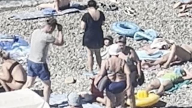 Сочи,Лазаревское , на пляже полно народу , солнце, оч.тепло, загорают,купаются, прекрасное ласковое море волшебного цвета