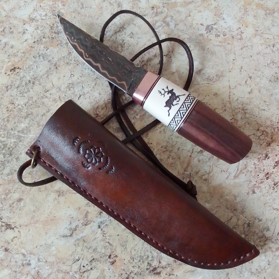 Представляем приятный и очень удобный нож для мелких работ во время активного отдыха и просто для души. Пользуйтесь с удовольствием! Модель: Коготь Монтаж: сквозной Клинок: ламинат к110+65г+медь+никель (твёрдость 61 HRC),ромбовидное сечение клинка, спуски вогнутой линзой и далее режущая кромка Рукоять: бивень мамонта 1й сорта, морада Декорирование: - оксидирование клинка - больстер из мокумэ - проставки из бронзы с проточками - резьба и колеровка акрилом по рукояти - ножны растительного дубления с тиснением Не является ХО, сертификат имеется, ножны в комплекте. Размеры в мм: Общая длина - 183 Длина-ширина-толщина клинка - 86-24-3,5 Длина-ширина-толщина рукояти – 97-32-23 ЦЕНА на момент публикации: 32000 р, + доставка (почта, СДЭК) ВНИМАНИЕ!! Если Вам понравилась модель ножа, но хочется его в каком-то другом исполнении, обращайтесь – договоримся. По всем вопросам и заказу ножей обращайтесь: Олег Александрович Киршанов (директор по развитию ООО «Ножеяр») Тел/whatsapp +79202979792 (c 8 до 19 ч МСК) Вконтакте https://vk.com/nozheyaaar Ярмарка мастеров https://www.livemaster.ru/nozheyaaar Инстаграмм https://www.instagram.com/nozheyaaar НОЖЕЯР: хорошие ножи для хороших людей!