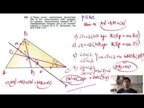 №245. Через точку пересечения биссектрис ВВ1 и СС1 треугольника ABC проведена прямая, параллельная прямой ВС и пересекающая стороны AB и АС соответственно в точках М и N. Докажите, что MN =ВМ + CN. Поддержать канал рублём - 5469400944002125 (Сбербанк) Мой второй канал для подготовки к ЕГЭ и ОГЭ - https://www.youtube.com/ЕвгенийСумин Инстаграм - https://www.instagram.com/EGE_OGE.math Личный инстаграм - https://www.instagram.com/ee_sumin VK - https://vk.com/evgeniysumin FB - https://www.facebook.com/EvgeniySumin
