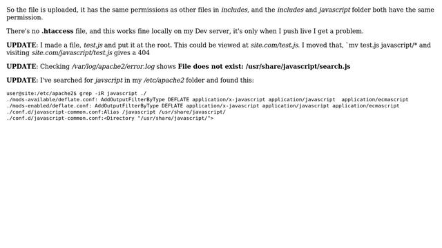 Javascript 404 not found, but PHP and CSS loading Helpful? Please support me on Patreon: https://www.patreon.com/roelvandepaar With thanks & praise to God, and with thanks to the many people who have made this project possible! | Content (except music & images) licensed under CC BY-SA https://meta.stackexchange.com/help/licensing | Music: https://www.bensound.com/licensing | Images: https://stocksnap.io/license & others | With thanks to user sumit (serverfault.com/users/227017), user Pete (serverfault.com/users/65594), user Nathan C (serverfault.com/users/173547), and the Stack Exchange Network (serverfault.com/questions/521585). Trademarks are property of their respective owners. Disclaimer: All information is provided "AS IS" without warranty of any kind. You are responsible for your own actions. Please contact me if anything is amiss at Roel D.OT VandePaar A.T gmail.com