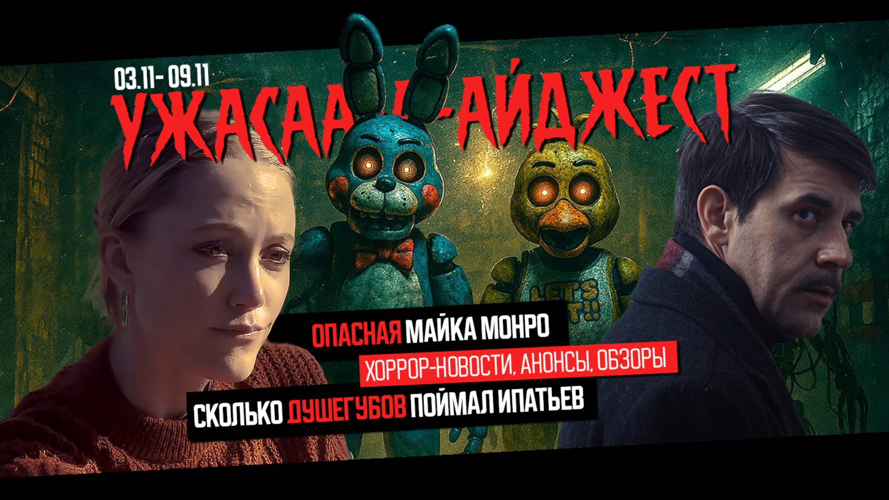 Три обзора на новые ХОРРОРЫ, самые КАССОВЫЕ УЖАСЫ уикенда, анонсы НОВИНОК жанра, черный ЮМОР и другие рубрики. Хоррор-дайджест телеграмм-канала "УЖАСАРИУМ" https://t.me/uzhasarium ▬▬▬ Сегодня в выпуске: 00:00 - Новости бокс-офиса. Черный телефон 2 00:52 - "MAN FINDS TAPE" 01:21 - "МЕТОД ИСКЛЮЧЕНИЯ" - претендент на Оскара 02:10 - "ВАМПИР" из Индии 02:29 - "ОЧЕНЬ СТРАННЫЕ ДЕЛА" - 5 сезон 02:56 - DEVOUR" - вампиры против оборотней 03:23 - "ПЯТЬ НОЧЕЙ С ФРЕДДИ 2" - сиквел уже скоро 04:04 - "ТУРБУЛЕНТНОСТЬ" - триллер с Ольгой Куриленко 04:41 - НОВОСТИ одной строкой 07:01 - "РУКА, КАЧАЮЩАЯ КОЛЫБЕЛЬ" - обзор 11:15 - "ДУШЕГУБЫ: 1989" - обзор 16:02 - "ПРОКЛЯТИЕ ПУСТОШИ" - обзор 19:10 - ХОРРОР КВИЗ 19:57 - ЧЕРНЫЙ ЮМОР 20:10 - ХЭЛЛОУИН - хоррор в цифрах ▬▬▬ На этом канале вы увидите и услышите по-настоящему СТРАШНЫЕ И ЛЕДЕНЯЩИЕ КРОВЬ ИСТОРИИ, ТОПчики, ОБЗОРЫ и подборки ФИЛЬМОВ УЖАСОВ и уникальные проекты по ХОРРОР ВСЕЛЕННОЙ. ▬▬▬
