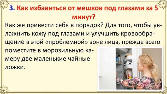 http://krasota.znaju-kak.com/ - Эффективные средства для красоты и ухода за собой С кем не случалось такого: мы просыпаемся утром и видим в зеркале тусклые растрепанные волосы, шелушащиеся губы, прыщик на носу, мешки под глазами… Конечно, каждой женщине хочется выйти из дома красавицей, чтобы вызывать зависть у женщин и ловить восхищенные взгляды мужчин. Но порой нам просто не хватает времени по утрам, чтобы привести себя в порядок. «Что же делать?» – спросите вы. Далее мы поделимся с вами несколькими простыми и полезными советами о том, как «навести красоту» всего за 5 минут! 1. Как привести в порядок непослушные волосы? Вам знакома следующая ситуация? Вы моете волосы вечером перед сном и надеетесь проснуться красивой, но что же вы видите утром в зеркале? Волосы топорщатся и стоят «торчком», совсем как по моде 80-х. В наше время однако такая экстравагантная прическа вряд ли в тренде и уж точно не понравится коллегам по работе. Что же делать, когда времени на то, чтобы заново помыть и уложить волосы, совсем не осталось? Прежде всего, прекращаем панику и следуем этим советам. Вам понадобится полстакана воды: просто немного намочите волосы, прядку за прядкой. После этого отмерьте половину чайной ложки миндального масла, разотрите его между ладонями и нанесите на волосы легкими движениями, параллельно укладывая непослушные волосы. Способ укладки зависит от структуры ваших волос: если они от природы вьющиеся и непослушные, то нанесите масло на каждый локон, чтобы выпрямить и «обрисовать» его. Если же у вас прямые волосы, то начните укладку от корней и «пройдитесь» по всей длине волос. Вот увидите: всего немного терпения – и проблема с беспорядком на голове решена! 2. Что делать, если на лице выскочил прыщик? Классический сюжет для утреннего кошмара каждой женщины. Вы смотрите в зеркало и видите, что на вашем носу, лбу или щеке «красуется» неприятный и довольно заметный прыщик, который совсем некстати привлекает к себе внимание. Что же здесь можно посоветовать, если через несколько минут вы должны выбегать из дома? Не стоит переживать, есть очень простое средство. Прежде всего тщательно умойте лицо с нейтральным мылом, чтобы очистить кожу от бактерий. После этого добавьте в чайную ложку лимонного сока несколько капель яблочного уксуса. Полученную смесь нанесите на поврежденный участок кожи, то есть поверх прыщика. Оставьте такую смесь на 3 минуты, но не дольше, потому что в противном случае уксус и лимон могут оказать противоположный эффект и пересушить кожу. Снова хорошенько умойте лицо и вытрите чистым полотенцем. Теперь можно нанести привычный макияж. Если у вас на лице выскочил прыщик красного цвета, имеет смысл использовать тонирующий карандаш с зеленым оттенком, потому что этот цвет поможет скрыть покр?