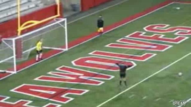 Во время исполнения пенальти, вратарь пытался смутить игрока своими акробатическими трюками.