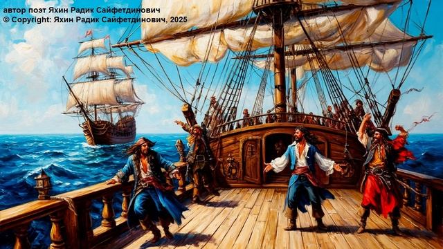 Ветер рвет паруса, соль на губах, Солнце жжет спину, в глазах – страх. Но мы не дрогнем, не свернем с пути, За горизонтом – новая жизнь, смотри! Волны бьют в борт, как сердца стук, В руках – сталь, в душе – азартный дух. Мы – дети што?рма, хозяева морей, Идем вперед, не зная цепей. Блеск золота манит, зовет за собой, Свобода – наш флаг, наш вечный бой. Под черным небом, где звезды горят, Мы ищем сокровища, где они спят. Пусть грозы гремят, пусть бушует прибой, Мы держим курс, мы идем за мечтой. Капитанский взгляд, решительный шаг, Наш путь – это риск, наш путь – это флаг! Шум волн, крики чаек, далекий зов, Загадки островов, древних миров. Мы слышим шепот легенд, старых карт, Где спрятан клад, где ждет нас старт. Не страшен нам враг, не страшен нам бой, Мы вместе стоим, плечом к плечу, герой. И пусть говорят, что мы – зло, что мы – грех, Мы просто живем, неся свой смех. Блеск золота манит, зовет за собой, Свобода – наш флаг, наш вечный бой. Под черным небом, где звезды горят, Мы ищем сокровища, где они спят. Пусть грозы гремят, пусть бушует прибой, Мы держим курс, мы идем за мечтой. Капитанский взгляд, решительный шаг, Наш путь – это риск, наш путь – это флаг!