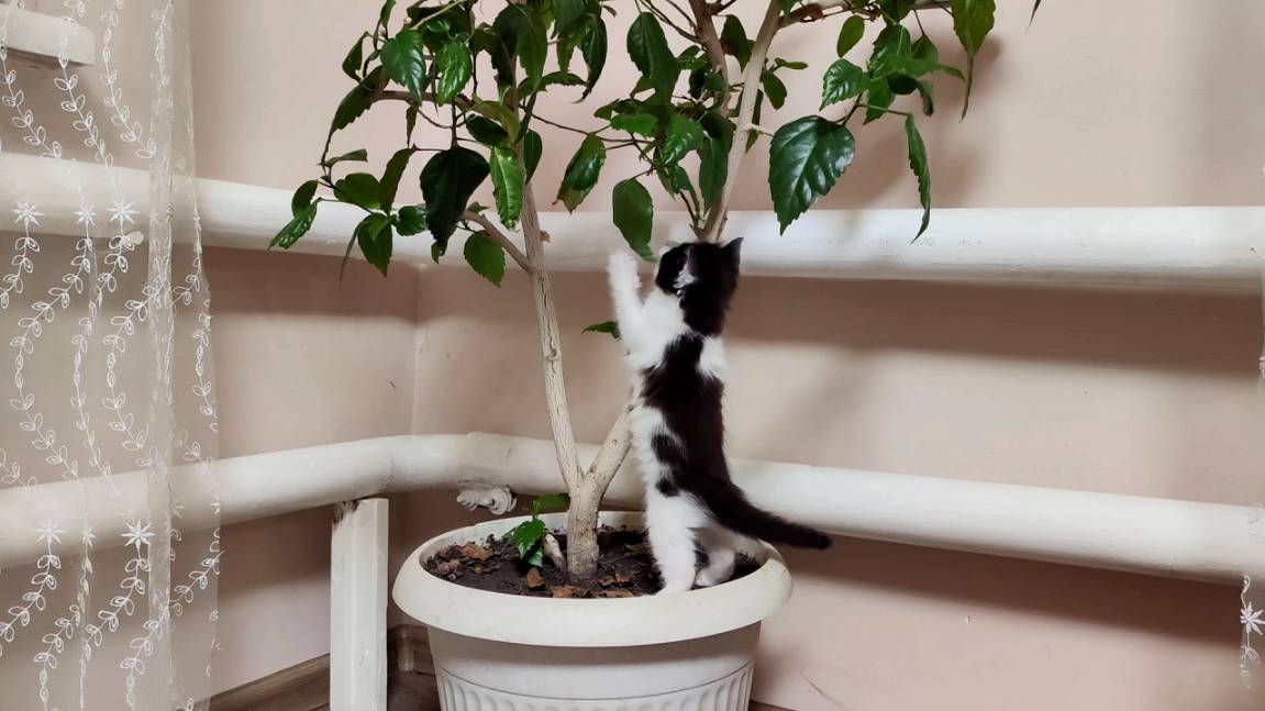 Забавный котенок и комнатные растения.