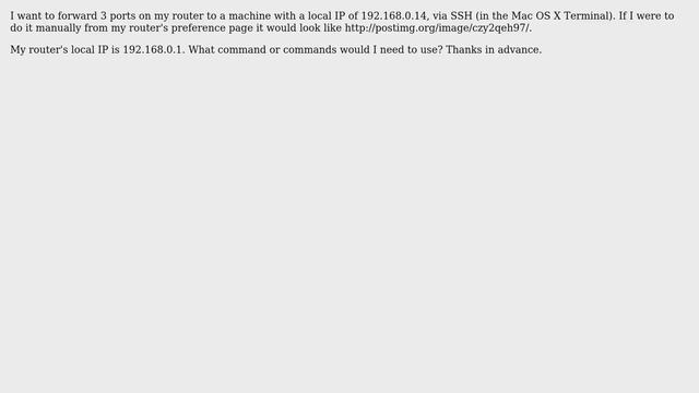 Port Forwarding on Router via SSH Helpful? Please support me on Patreon: https://www.patreon.com/roelvandepaar With thanks & praise to God, and with thanks to the many people who have made this project possible! | Content (except music & images) licensed under CC BY-SA https://meta.stackexchange.com/help/licensing | Music: https://www.bensound.com/licensing | Images: https://stocksnap.io/license & others | With thanks to user user1599051 (superuser.com/users/349353), user Abraxas (superuser.com/users/357027), and the Stack Exchange Network (superuser.com/questions/802776). Trademarks are property of their respective owners. Disclaimer: All information is provided "AS IS" without warranty of any kind. You are responsible for your own actions. Please contact me if anything is amiss at Roel D.OT VandePaar A.T gmail.com