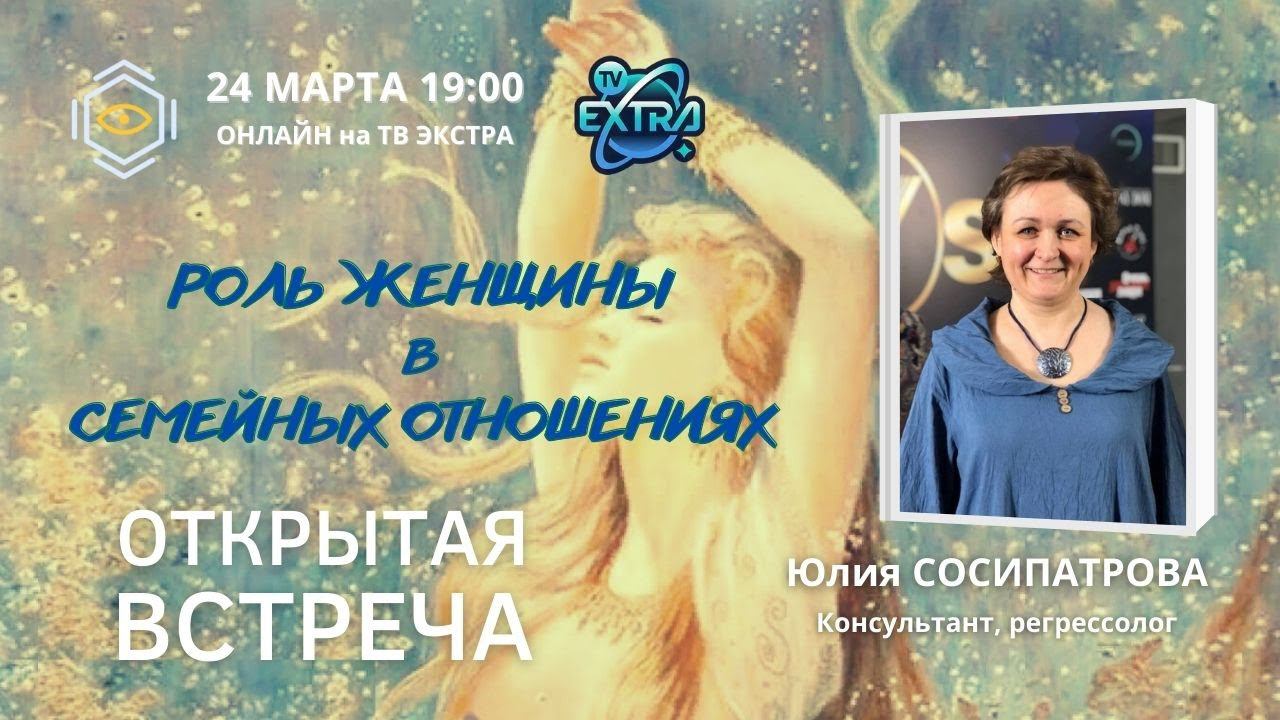 24 марта в 19:00 на You Tube канале ТВ Экстра консультант-регрессолог Юлия СОСИПАТРОВА В Новой встрече мы решили продолжить разговор о Женщине, ее роли, поведении в семье, о ее влиянии на жизнь семьи и всех ее членов. На встрече мы поговорим о том: - Насколько отношения между женой и мужем влияют на их путь, на развитие семьи, на судьбу каждого из них и судьбу их потомков? - Какое место старается занять женщина в семье, и как это влияет на всех членов семьи? - Насколько гармонично отражается поведение женщины на муже и потомках и на общем укладе семьи? - Как женщине справляться со взятыми на себя задачами перед семьей, родом и как при этом сохранить себя? И как определить, те ли задачи она выбрала, не опираясь на стереотипы и родовые программы? - Насколько распространено влияние женщины на семейную карму? Вопросы можно задавать в прямом эфире, а так же заранее присылать на e‑mail: info@probujdenie.ru _____________________ Подробнее о специалисте и консультациях на персональной странице Юлии СОСИПАТРОВОЙ https://probujdenie.ru/persony/julia_sosipatrova/ Мастер-класс с Юлий Сосипатровой в рамках конференции НЕПОЗНАННОЕ "Практическая медитация по работе с препятствиями в жизни" https://probujdenie.ru/master-klassy-konferencii-nepoznannoe-v-zapisi/ ______________________ https://probujdenie.ru/qhht/dolores_cannon_qhht/ - официальное сертифицированное обучение методу Долорес Кэннон QHHT от Академии Долорес ____________ https://www.facebook.com/groups/tvextra/ - группа телеканала в Фейсбук https://t.me/nepoznannoe_online - Группа ТВ Экстра в Телеграм