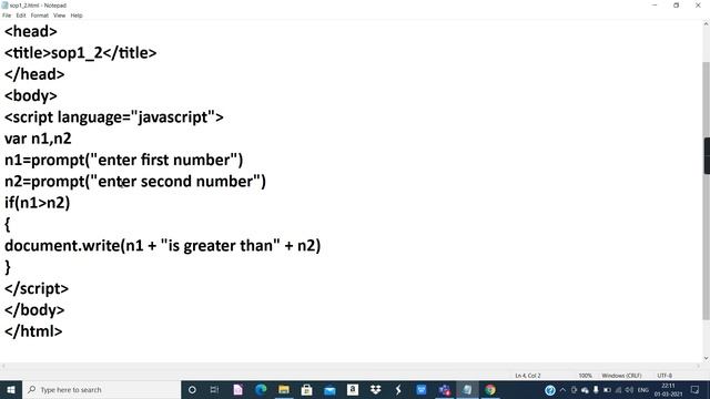 Click on the link for other videos of Skill set 3 - JavaScript https://youtube.com/playlist?list=PLoONJDdxEfrl58-Aj90dlqAQvUOsq8PFa SOP 1 : Create JavaScript program for the following using appropriate variables, JavaScript inbuilt functions and control structures.  To accept two integers and display larger number of them.