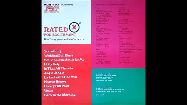 Keyboardist, producer and arranger for many artists. Ron Frangipane also had a string orchestra. I couldn't find all these songs on You Tube so this is the full album of "Rated X For Excitement" from 1970. 1. Something 2. Venus @2:48 3. Holly Holy @6:51 4. Heaven Knows @10:43 5. Early In The Morning @13:15 6. Wedding Bell Blues @17:05 7. Smile A Little Smile For Me @19:21 8. Jingle-Jangle @22:16 9. Cherry Hill Park @25:23 10. Is That All There Is @27:59 11. La La La (If I Had You) @31:31