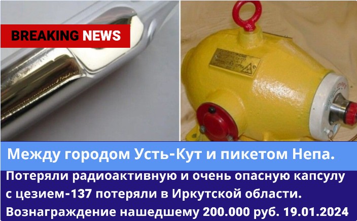 ☢️Радиоактивную и очень опасную капсулу с цезием-137 потеряли в Иркутской области. Капсулу с опасным веществом потеряла исследовательская группа в районе Чаяндинского месторождения 12-13 января. Генеральный директор компании «ТНГ-Групп» сообщил, что защитная капсула с источником были потеряны между городом Усть-Кут и пикетом Непа. Такой инцидент произошёл впервые за 70 лет из-за особо сложных погодных условий. Нашедшему или обладающему информацией о местонахождении цезия обещают премию 200 тысяч рублей при обращении в компанию или правоохранительные органы
