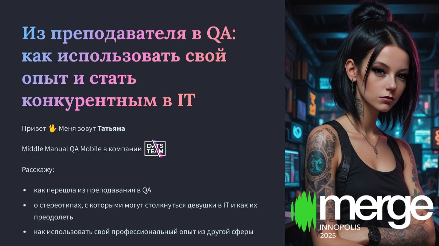 В докладе расскажу свою историю перехода из преподавателя в QA, а также поговорим о стереотипах, с которыми сталкиваются девушки в IT, особенно в тестировании. Мой доклад будет полезен тем, кто задумывается о смене карьеры или в начале своего пути, Расскажу: - Как использовать свой профессиональный опыт из другой сферы - Как преодолеть стереотипы и есть ли они О спикере Пришла в IT из преподавания английского и многолетнего фриланса по дизайну. 3 года работаю QA Mobile и влюблена в свое дело по уши. Фанат обучения и всегда рада поделиться знаниями.