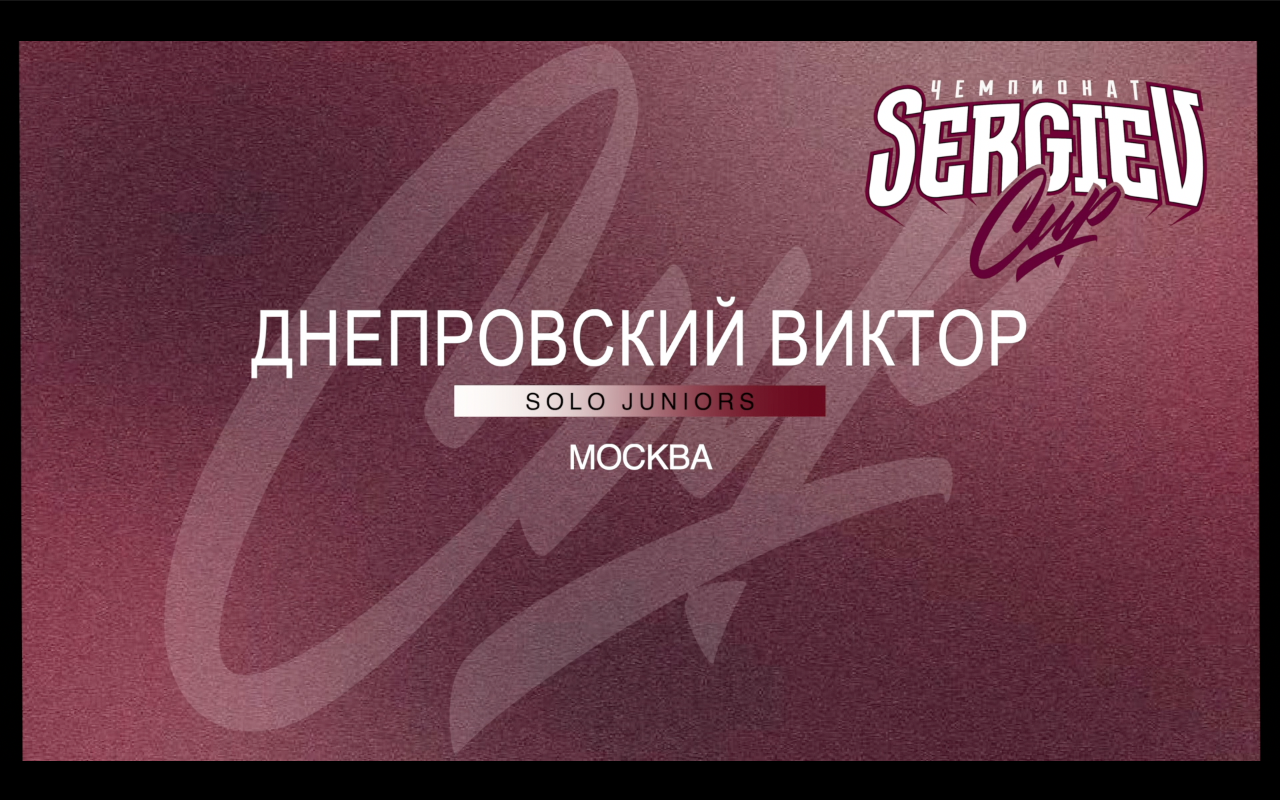 SERGIEV CUP 2024 Днепровский Виктор Номинация: Solo Категория: Juniors Жюри чемпионата: Тоха Андреев Артем Соляник Артем Нефедов ОРГАНИЗАТОР МЕРОПРИЯТИЯ: TRIASH PRODUCTION Информация о предстоящих чемпионатах: Telegram : https://t.me/triash_prod ВК : https://vk.com/sergiev_cup YOUTUBE : https://www.youtube.com/channel/UCPDX3Znh7OJQqmb0v5u1MHw Дополнительная информация : +7 (916) 533-50-63