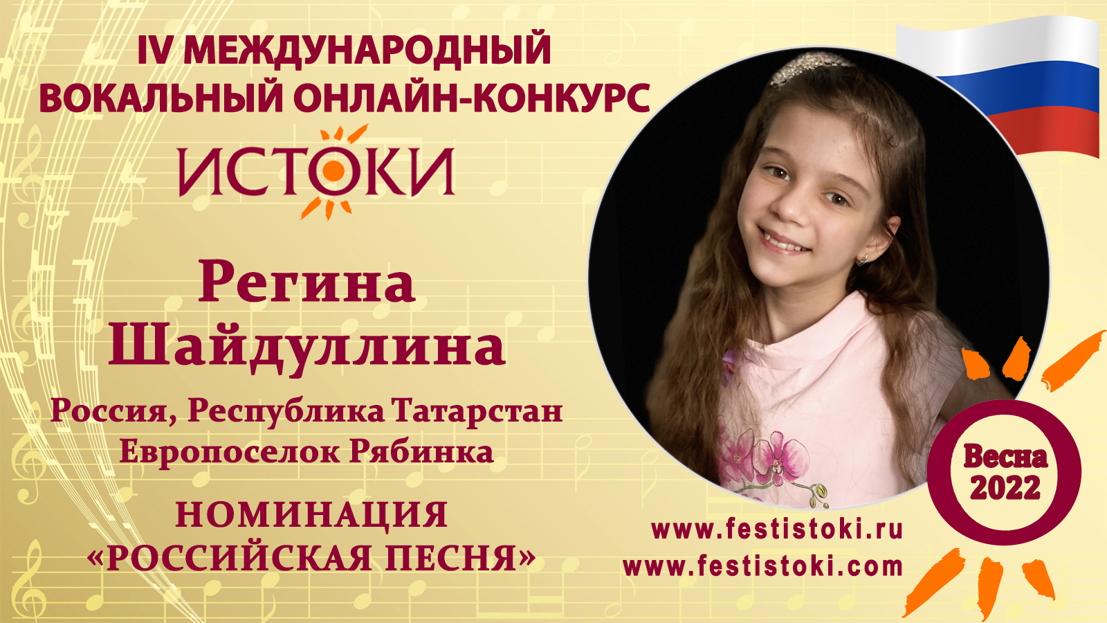 Лауреат II степени IV Международного вокального онлайн-конкурса «Истоки».Весна-2022. Номинация "Российская песня". Песня "Перышко". Автор слов - Андрей Усачев, автор музыки - Александр Пинегин. Сайт: www.festistoki.ru / www.festistoki.com E-mail: festistoki@mail.ru