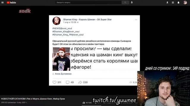 Yuwnee смотрит НОВОСТНОЙ САТАНИЗМ | Рик и Морти, Шаман Кинг, Майор Гром \ сыендук