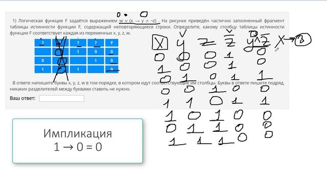 http://egoroffartem.pythonanywhere.com/ege/task/2 На сайте размещены другие задания по этой теме http://egoroffartem.pythonanywhere.com/ege/videotask/2 Список всех разборов 2 задания из ЕГЭ по информатике: https://www.egoroffartem.ru/ege/videotask/ Видео решения задач по ЕГЭ информатике https://vk.com/egoroff_channel В данном группе можете найти информацию о новых видео и задать вопросы по ЕГЭ Информатике Разбор задания № 2 ЕГЭ ИНФОРМАТИКА Тема задачи "Логические функции" Логическая функция F задаётся выражением w ∨ (x → y ∧ ¬z) . На рисунке приведён частично заполненный фрагмент таблицы истинности функции F, содержащий неповторяющиеся строки. Определите, какому столбцу таблицы истинности функции F соответствует каждая из переменных x, y, z, w.