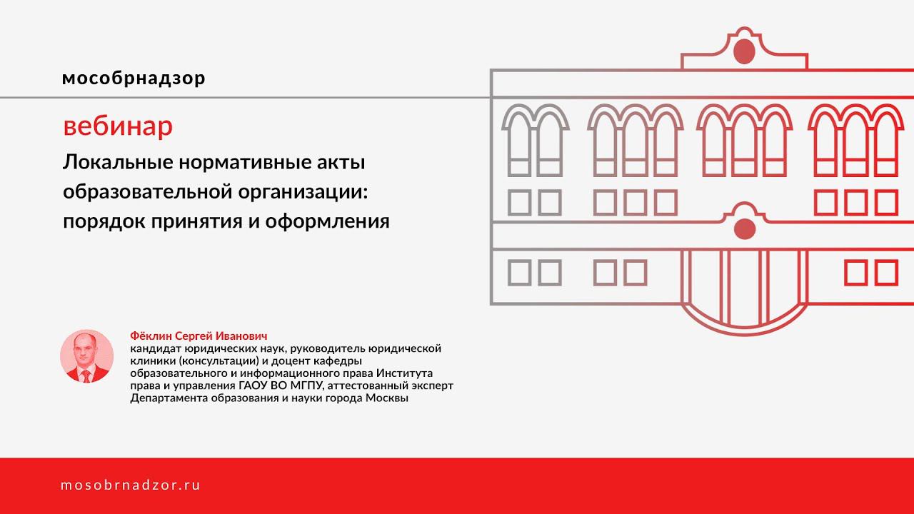 Вебинар «Локальные нормативные акты образовательной организации: порядок принятия и оформления» был проведен в рамках проекта Мособрнадзор.РФ 12 ноября 2021 года. Ведущий вебинара - Фёклин С.И. Страница вебинара на сайте проекта - http://mosobrnadzor.ru/prevention/webinars/2021-11-12_17-30