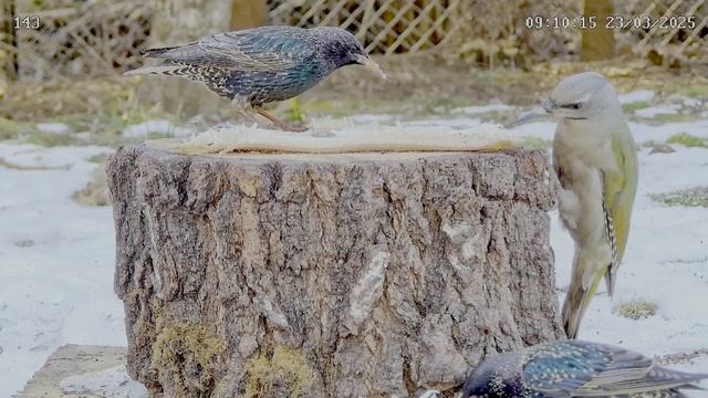 Дятел показывает свое возмущение скворцам