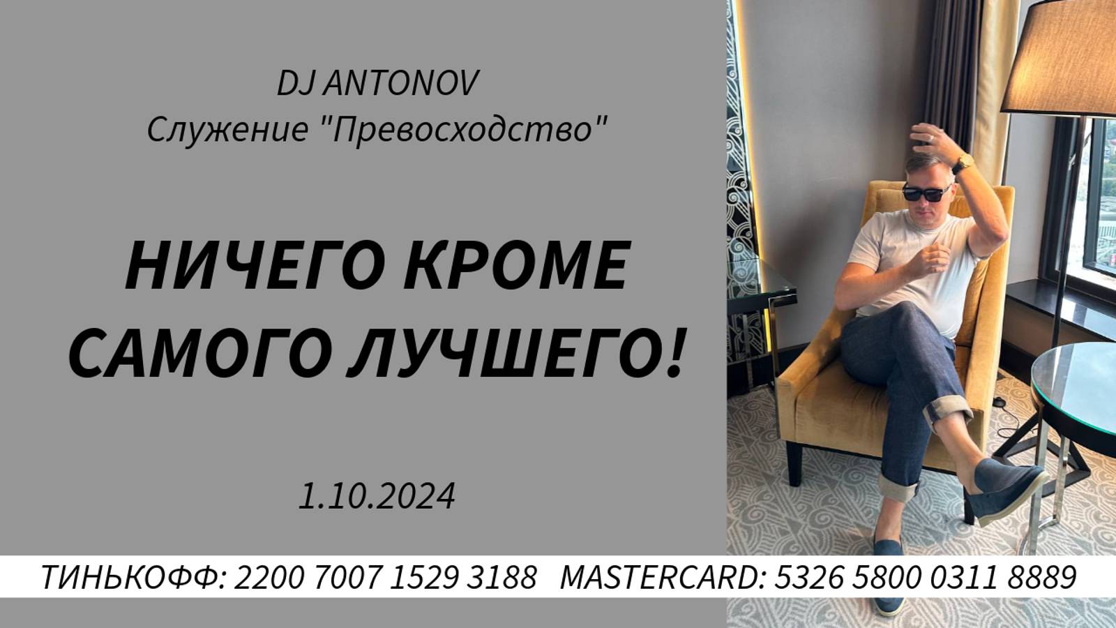 Согласитесь с самым лучшим! #djantonov #превосходство #деньгиприходят Если вы хотите сеять хорошее семя, то всегда давайте в те служения, которые вас питают. Сея в духовное, которое отвечает на ваши духовные вопросы и жизненные стремления и кормит ваш дух, вы сеете в то, что принесёт Божью жизнь в ваши обстоятельства. Пожертвовать в служение. TINKOFF КАРТА СИСТЕМЫ "МИР" VITALI ANTONAU Номер карты: 2200 7007 1529 3188 MASTERCARD Номер карты: 5326 5800 0311 8889 КОШЕЛЁК ЮМАНИ (ЯНДЕКС) НОМЕР: 4100 1704 1004 945 КАРТА ЮМАНИ (ЯНДЕКС ДЕНЬГИ) (для партнёров из России) Номер карты: 2204 1202 0163 9313 Через систему денежных переводов "MONEYGRAM" или "Золотая Корона" ( напишите на эмейл dj_antonov@mail.ru и Вам вышлют паспортные реквизиты для перевода) Крипто-кошелёк для пожертвований USDT через сеть (TRC20) TYFMGxeVagHkaXzhNkCpdVQ9XMKcx9Dh71 Пусть Бог умножит Ваше семя!!!