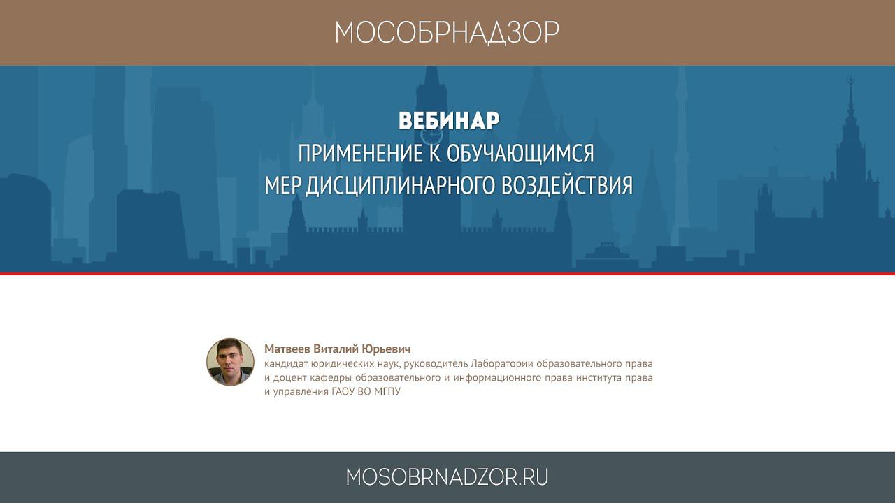 Вебинар «Применение к обучающимся мер дисциплинарного воздействия» был проведен в рамках проектов Мособрнадзор.РФ и Правоспо.РФ 25 марта 2020 года. Ведущий вебинара - Матвеев В.Ю. Страница вебинара на сайте проекта мособрнадзор - http://mosobrnadzor.ru/supervision/webinars/2020-03-25_16-30