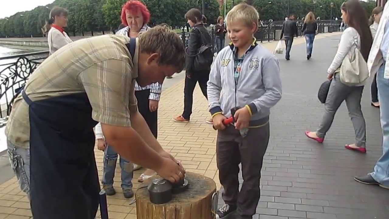 Наша прогулка по Калиниграду .Мой сын Илья пытается отчеканить монетку с изображением Мюнхаузена. Есть легенда,что барон Мюнхаузен служил в армии в Кенигсберге