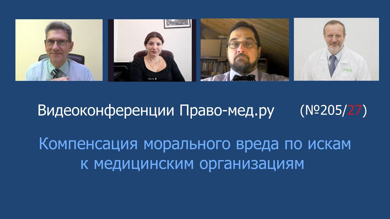 Видеоконференция Право-мед.ру № 205 (27) от 10 ноября 2022 года, на которой обсуждался проект постановления Пленума Верховного Суда РФ «О практике применения судами норм о компенсации морального вреда". Рассмотренный вопрос 1.Предлагаемые новеллы и их влияние на гражданскую ответственность медицинских организаций. Тайминг Панов А.В., вступление 01:43-08:28 Гаганов Д.Б. 08:42-14:15 Степанов И.О. 14:21-18:03 Галюкова М.И. 18:18-23:00 Панов А.В. 23:05-26:25 Участники: Панов Алексей Валентинович, главный редактор информационного портала Право-мед.ру, г. Омск , член АЮР Гаганов Дмитрий Борисович, юрисконсульт Ассоциации организаторов здравоохранения в онкологии г. Санкт-Петербург Галюкова Мария Игоревна, федеральный судья, Центральный районный суд г. Челябинск Степанов Игорь Олегович, врач - невролог, клинический фармаколог, юрист, председатель Ярославской областной общественной организации инвалидов-больных рассеянным склерозом "Гефест", г. Ярославль, член АЮР