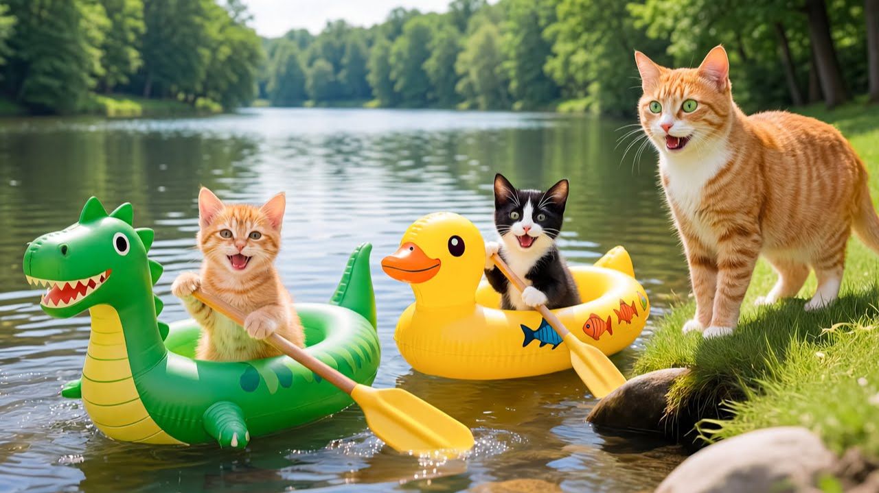 😹Мама кошечка со своими маленькими котятками плавают на воздушных игрушках по воде🔥