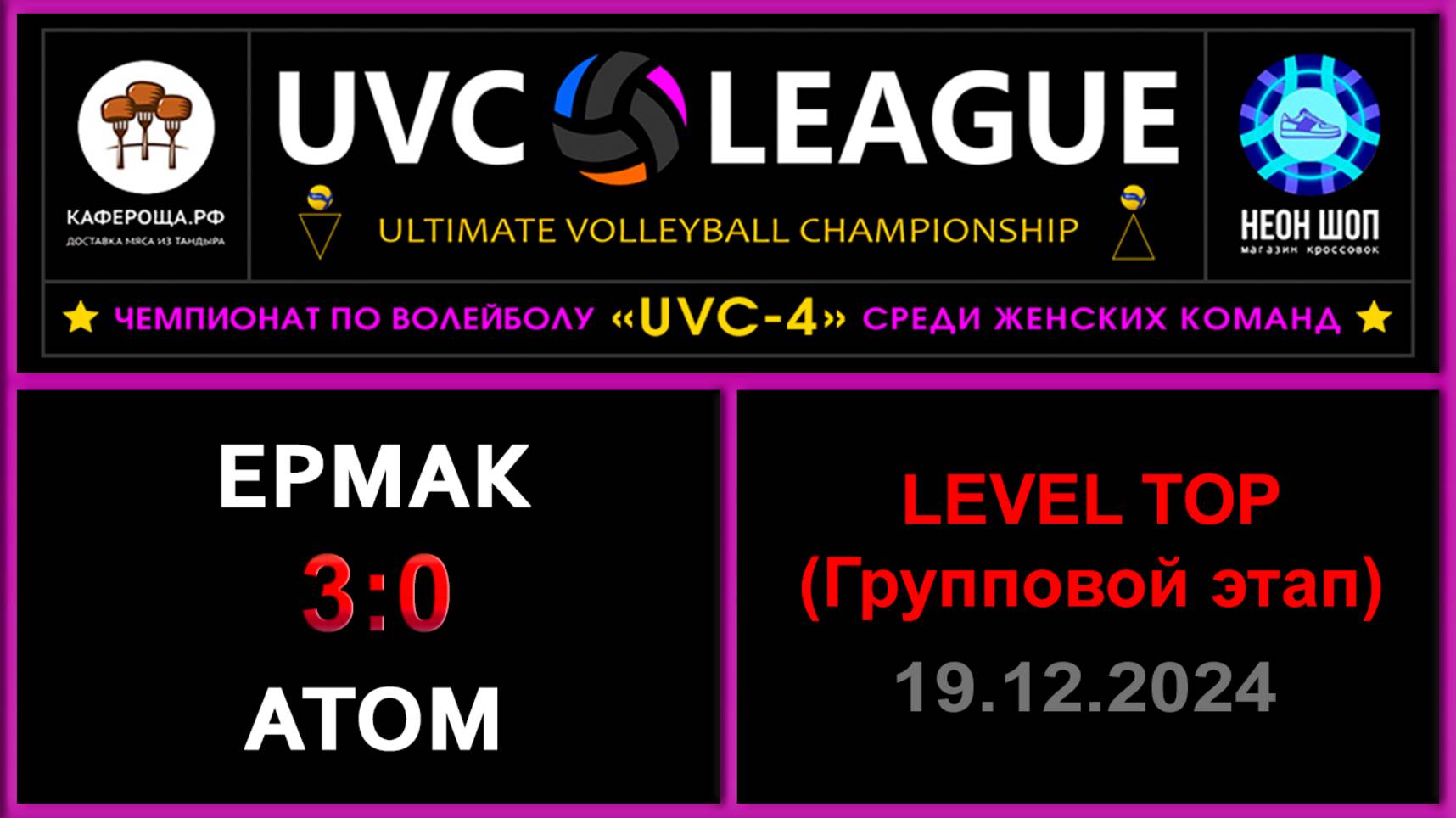 UVC-4 (Девушки): Чемпионат UVC Лиги по волейболу среди женских команд 2024-2025 гг. Результаты игры: LEVEL ТОР (Групповой этап) 19.12.2024 Ермак - АТОМ 3:0 (25:23, 25:23, 25:17) Конкурс «РЕШАЛА»: ✅АТОМ прошел в следующий этап! #UVC_ЛИГА_ЧЕМПИОНАТ_UVC_4_Девушки