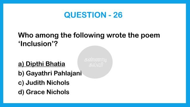 PDF file link for Revision test 4 Questions : https://drive.google.com/uc?export=download&id=1w4UuSuUTsAtkKDe3UAS2QYH1Eodsk-rD PDF file link for Revision test 4 Answers : https://drive.google.com/uc?export=download&id=1tPyV85xmIx-EgitI6tOWYfUzRiNuALMN To watch remaining test videos, click the link : https://www.youtube.com/playlist?list=PLQNcavob72Jn-LJhJwTZvJIfEmEyvX-Hf Our Telegram channel : https://t.me/kannaadikalvi Infinitive, Gerund, Participle Topic video : https://www.youtube.com/watch?v=HGEA7P3GqMs Compound words part 1 : https://www.youtube.com/watch?v=4jhA8gBm-1Q Compound words part 2 : https://www.youtube.com/watch?v=7305_wFMWHY TOPIC NUMBER-7(Dr. Karl Paulnack - Music The Hope Raiser) video : https://www.youtube.com/watch?v=x5H8W80cfoo Match the Poems with the Poets video : https://www.youtube.com/watch?v=q1n970r_fpY Nationality of the Poet : https://www.youtube.com/watch?v=EpVvskKIg-c Matching the poets and poems : https://www.youtube.com/watch?v=213aMr4IyM0 Question tag Topic video : https://www.youtube.com/watch?v=IUEbsZzyZYg Question tag Previous year Q & A discussion : https://www.youtube.com/watch?v=CWwgQXTVoi0 Sentence pattern Topic video : https://www.youtube.com/watch?v=AU0xOGYCESY Sentence pattern Previous year Q & A discussion : https://www.youtube.com/watch?v=WU8DUYvocHo #tnpscgroup4 #kannaadikalvi #tnpscgeneralenglish #tnpscgroup2a #tnpscgroup2